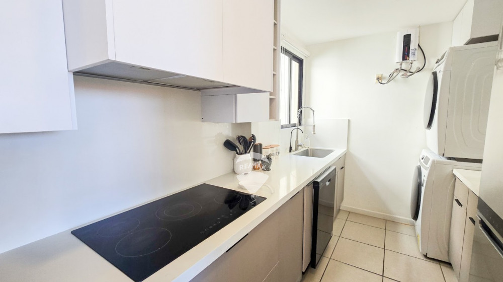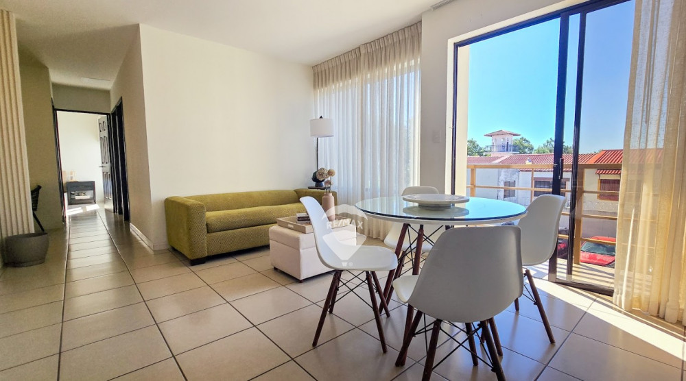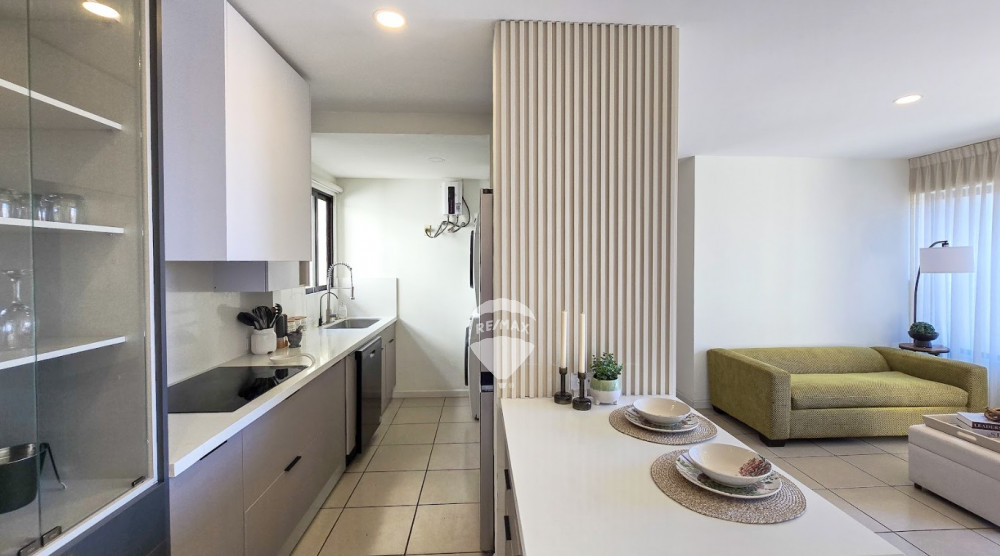 The apartment offers a spacious social area that integrates the living and dining room, as well as an ample kitchen equipped with a stove, refrigerator, and dishwasher. It also includes a washer and dryer for added convenience.